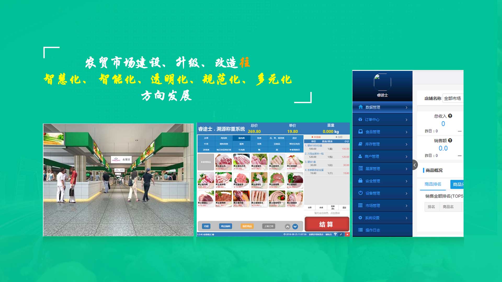 創(chuàng)新實(shí)現(xiàn)了【智慧農(nóng)貿(mào)溯源管理系統(tǒng)】與【智能稱重收銀】一體化解決方案,集市場管理、運(yùn)營管理、溯源追溯、智能收銀大數(shù)據(jù)運(yùn)用于一體,硬件、軟件與管理系統(tǒng)完美結(jié)合。適用于農(nóng)批、農(nóng)貿(mào)市場蔬菜、生鮮、水果、水產(chǎn)、肉類、熟食等稱重和非稱重銷售;由于采用一體化設(shè)計(jì),解決了傳統(tǒng)農(nóng)貿(mào)市場無法實(shí)現(xiàn)的信息化、智能化、可追溯的管理問題;使稱重、收銀、追溯、管理、更透明、公正、安全,讓顧客無后顧之憂,給管理工作帶來極大的便捷與高效,對國內(nèi)農(nóng)產(chǎn)品行業(yè)的發(fā)展、農(nóng)產(chǎn)品流通管理起到了典范作用。 【睿途士首創(chuàng)】顛覆傳統(tǒng)的“智慧農(nóng)貿(mào)市場系統(tǒng)”,解決了傳統(tǒng)農(nóng)貿(mào)系統(tǒng)單一安卓掛屏,昂視不方便看、不直觀、無互動性,傳輸信息不齊全、不穩(wěn)定的問題,也解決了按鍵電子秤商品難找、商品代碼難記、按鍵操作不靈活、支付不智能,對收銀管理、銷售商品、菜名、菜價、打折、優(yōu)惠、會員、線上下單、采購等無法實(shí)現(xiàn)實(shí)際菜品交易和追溯等問題。 更具顛覆性的是睿途士智慧系統(tǒng)擁有三大管理平臺(市場管理平臺、總部運(yùn)營管理平臺、商戶后臺管理平臺)、一個可視操作前臺和三大追溯功能,讓遠(yuǎn)程管理、數(shù)據(jù)傳輸、人機(jī)互動、智能控制、移動支付、大數(shù)據(jù)、互聯(lián)通信、云端存儲、人工智能、智能城市、電子定位、智能收銀等功能得以實(shí)現(xiàn)。